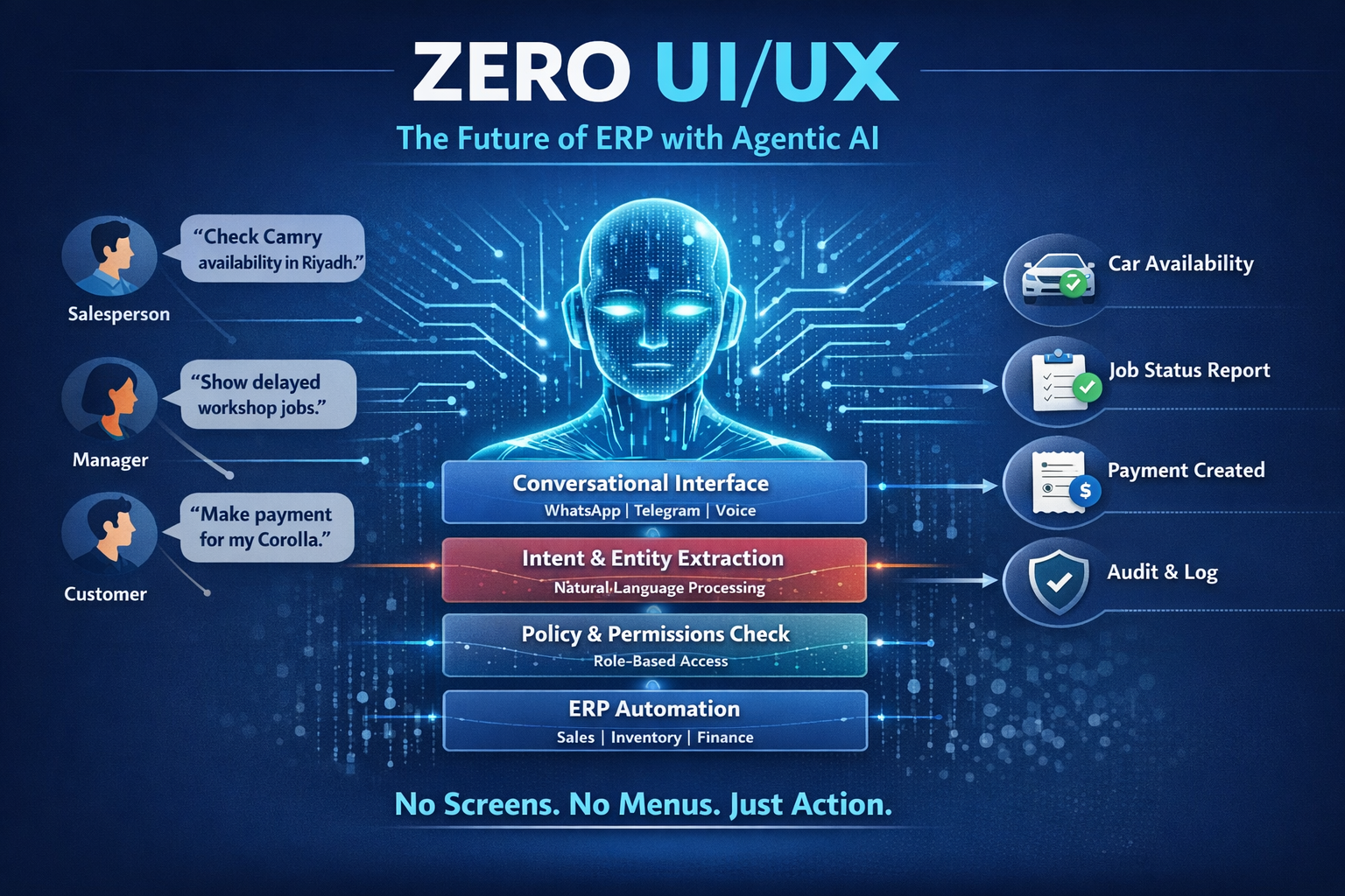 The system understands, verifies permissions, executes actions, and responds — all without traditional UI interaction.